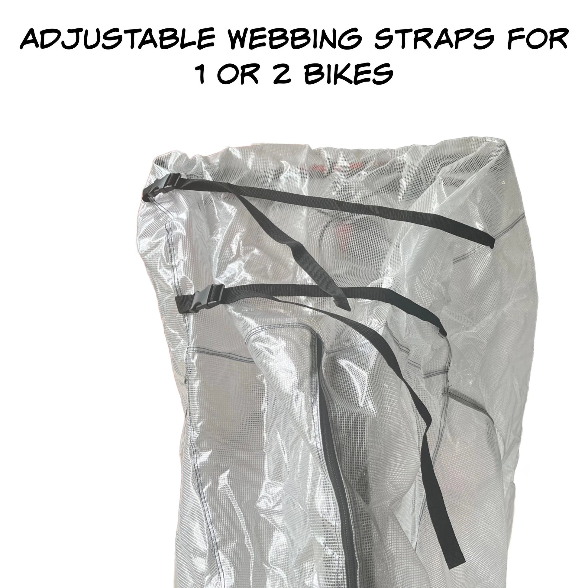 Completely encloses the bikes and seals at the hitch so you can rest easy knowing rain, road debris, and inclement weather will not wear on your bikes. Made Heavy Duty translucent reinforced scrim material that encloses the entire bike. Perfect for road trips for the back of your RV, Van, Truck, SUV, Trailer, Vehicle. Fits standard and extended wheel base bikes.